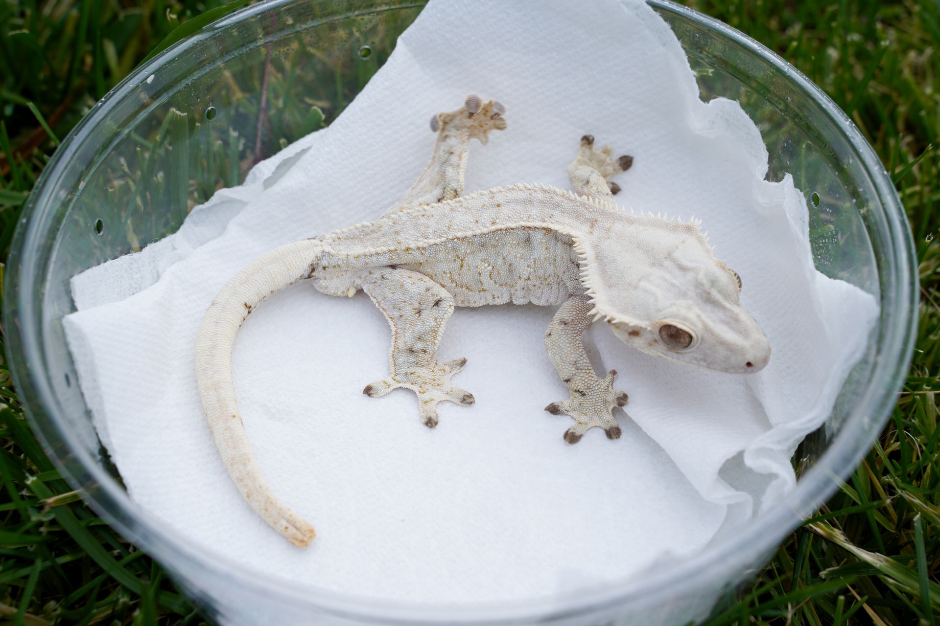 Ghost 👻 // Happy new year! This boy is missing a toe but is ready for the season! Coverage💯. I’ll pair him to other high coverage females and will keep building in more white. // Wishing you all an awesome 2024✌🏻 #gecko #crestedgecko